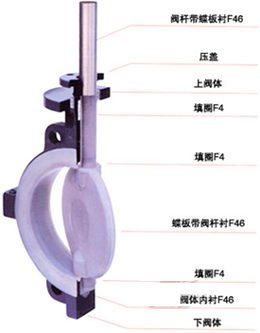 1.其基本類型有兩種,即D71F4和D71F46(中線)全襯里型對夾式蝶閥,采用對分兩片閥體組合,閥座與閥體內襯一體化,閥門工作時,只有全塑閥座與襯塑蝶板與介質接觸,產品可承受“除熔融堿金屬和元素氟”外的任何介質腐蝕,其中D71F46閥桿與蝶板(鍛)為一體,表面均勻包覆一層FEP。閥體通道內表面光滑,流體阻力小,CV值高,流通能力強,扭矩適中,采用四級密封結構并在密封面外配以耐溫抗老化的SI橡膠的彈性襯墊閥座,完全達到介質的零泄漏。