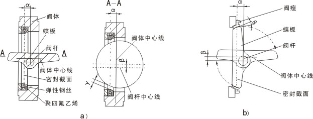 蝶板的回轉(zhuǎn)中心(即閥桿的中心)與蝶板密封截面偏置一個尺寸α,并與閥體通道軸線偏置一個尺寸β。