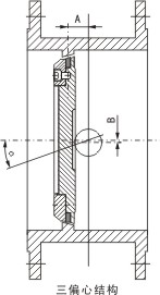 三偏心結構:閥桿軸線與蝶板密封面間偏置一個尺寸A,并與閥體通道軸線偏置一個尺寸B,閥座回轉軸線與閥體通道軸線形成一個偏心角α,故形成三偏心。蝶閥從0°~90°開啟時,蝶板密封面會在開啟的瞬間立即脫離閥座密封面,在其90°~0°關閉時,只有在關閉的瞬間,其蝶板圓錐形密封面才會接觸并壓緊閥座圓錐形密封。所以閥座與蝶板上的密封面之間無任何摩擦,去除了磨損和泄漏的可能性。