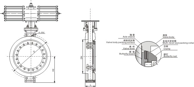 軟硬層疊式金屬密封結構:蝶板密封圈采用軟硬層疊式不銹鋼片和柔性石墨板的密封面,使其具有金屬硬密封和彈性密封的雙重優點,無論在低溫和高溫工況下均具有優良的密封性能。