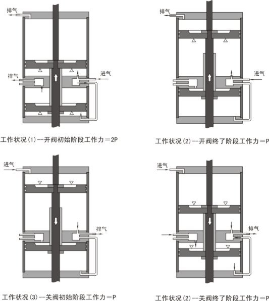本系列產品以O.4~O.6MPa(表壓)凈化壓縮空氣作為工作動力,推動活塞,帶動閘板作垂直于流體的位移,實現開啟開關閉閥門的目的。 雙層氣缸和緩沖機構的工作原理,按閘閥工作的四個階段分述如下:(附插原理圖①、②、③、④) 1、閘閥開啟前階段:上層氣缸的活塞(以下簡稱上活塞)和下層氣缸的活塞(以下簡稱下活塞)同時受力,閥桿在上、下活塞的推動下,以單活塞近二倍的提升力,克服閘板密封面和閥體密封面之間的最大靜摩擦力,帶動閘板上升。壓縮空氣由上氣缸的下氣室,經由設置在隔板的特定通道,通過連通管,到達下氣缸的下氣室,推動上下活塞同時工作。下氣缸上氣室中的氣體,經過設置在隔板內的另一特定通道。暢通無阻地排出氣缸體外。 2、閘閥開啟的后階段:在閘板稍稍開啟以后j下活塞就運行到了上死點,閘板在上活塞的帶動下,繼續提升,直至到了全開位置。 3、閘閥關閉的前階段:在上活塞的推動下,閘板離開全開位置,開始下降。 4、閘閥關閉的后階段:當上活塞碰到下活塞凸臺,并帶動下活塞一起繼續下降時,由于下氣缸上氣室的進氣通道和下氣缸下氣室的排氣通道設有阻礙,明顯地減慢了下行的速度,進至閘板下降到了全關位置。減緩閘板下行的沖擊,自行可關嚴閥門,又不使閥板楔得過緊,同時,還保護了密封面,免受猛烈沖擊而損壞。 |