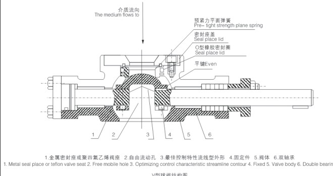 V型球閥采用帶彈簧或板簧加載閥座結構,由于彈簧/板簧的彈性恢復力推動閥座,可使球芯與閥座之間長期具有良好的密封性能。同時由于閥座采用彈簧加載的活動結構,可使閥座自動校正,以達到與球芯的最佳吻合。