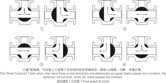 三通球閥一般采用兩閥座結構,如流向圖A所示兩種工況,選用兩閥座L型結構(即Q44型)。流向圖B中①和④兩種工況亦可選用兩閥座T型結構(即Q45型)。流向圖B中②和③兩種工況必須選用四閥座T型結構(即Q45型)。其余工況也可選用四閥座結構,但應在訂貨合同中注明閥座結構。 |
