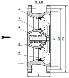 序號 零件名稱 材質 1 閥體 GG25 2 閥盤 QA19-4 3 軸承 QA19-4 4 彈簧 SYS316 5 導流體 GG25 6 閥座 QA19-4